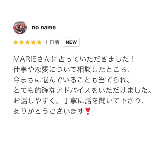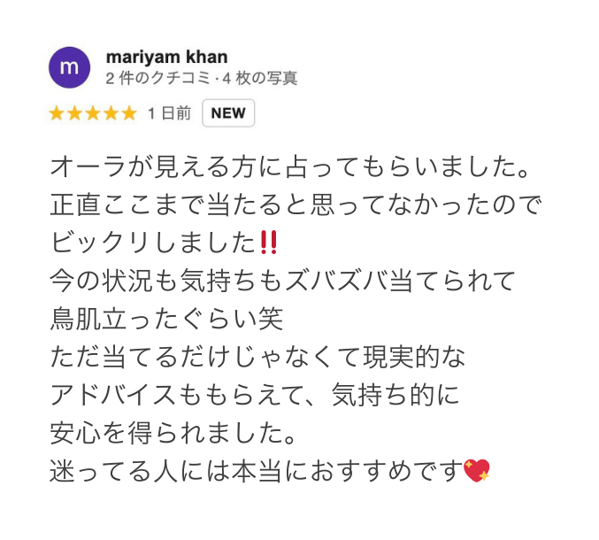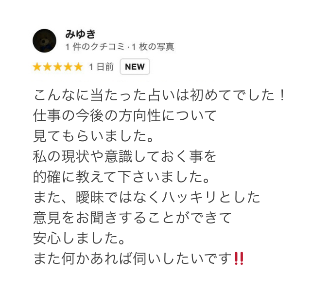 Googleでの口コミも他の占い館より遥かに高く平均星5.0の評価でした!